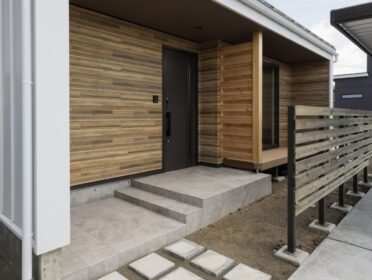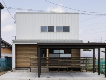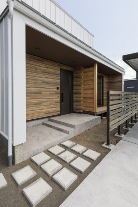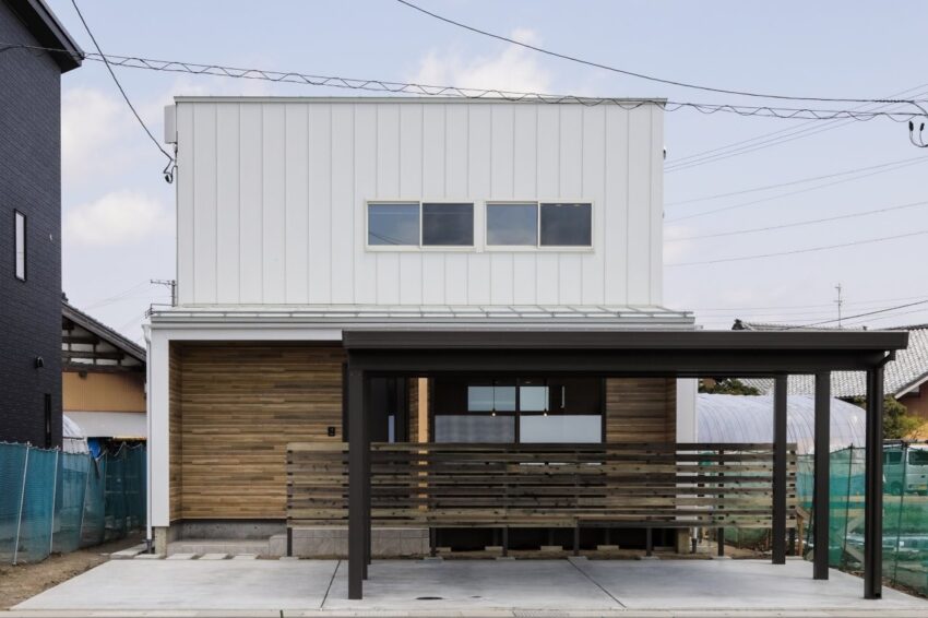 白いガルバリウムと木目のサイディングが美しく調和した外観。