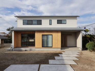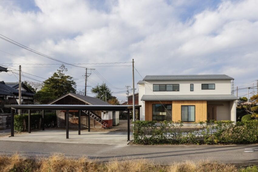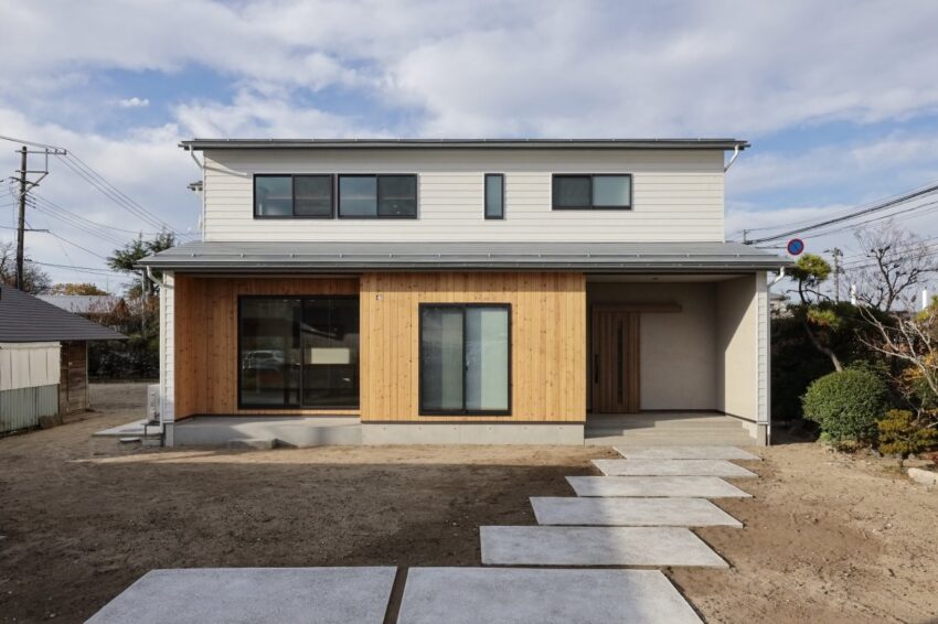 白いガルバリウムに、杉の木目と塗り壁が映える外観。