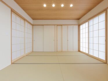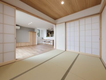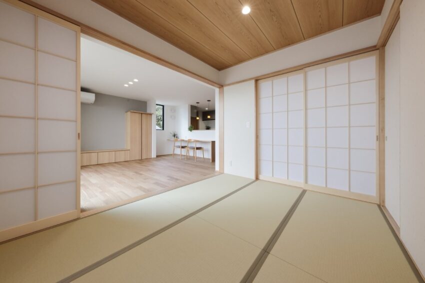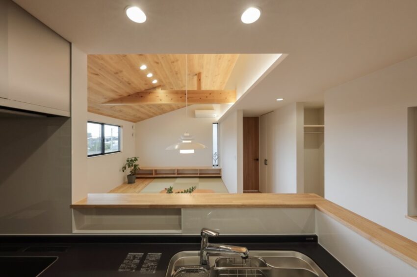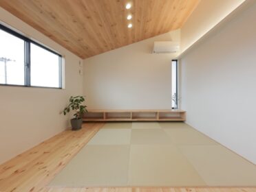 2階は、木目の勾配天井が開放的な畳リビングに、将来仕切って使える子ども部屋を。
